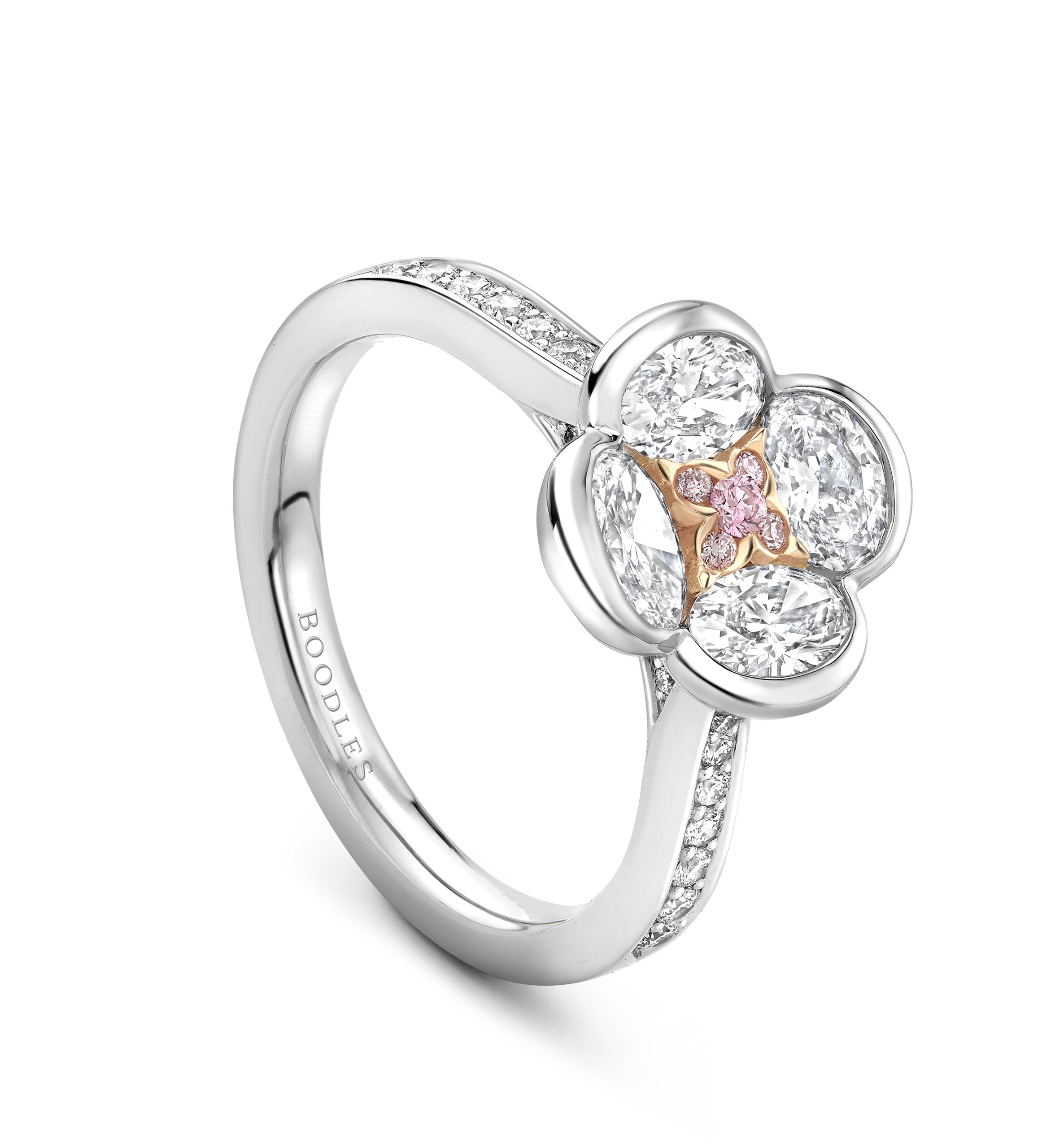 Boodles ‘The Rose’ design ring featuring oval cut, brilliant cut and pink diamonds set in Platinum and 18 carat Single Mine Origin rose gold