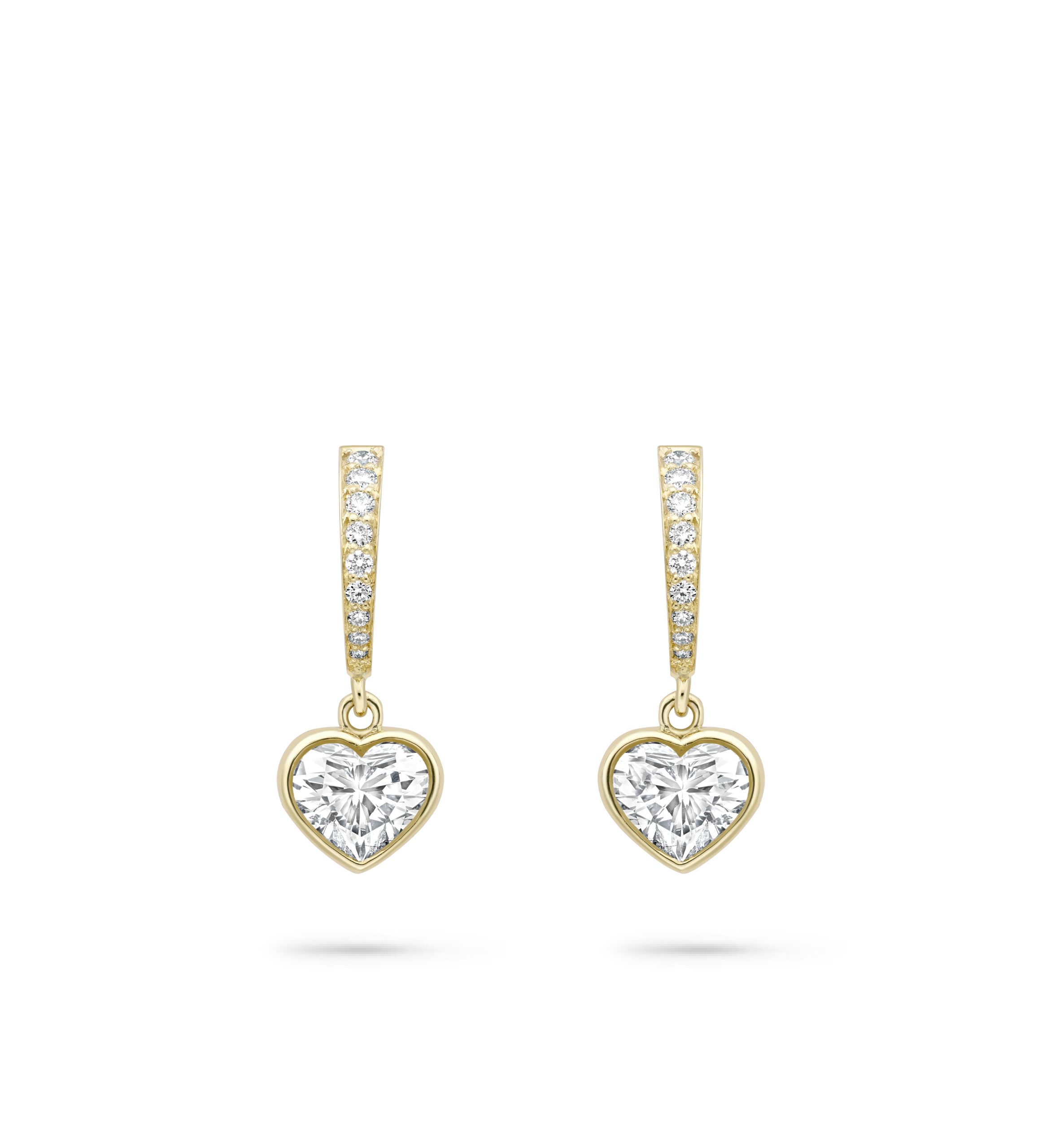 Boodles ‘Classic’ design earrings featuring heart shaped and brilliant cut diamonds set in 18 carat Single Mine Origin yellow gold