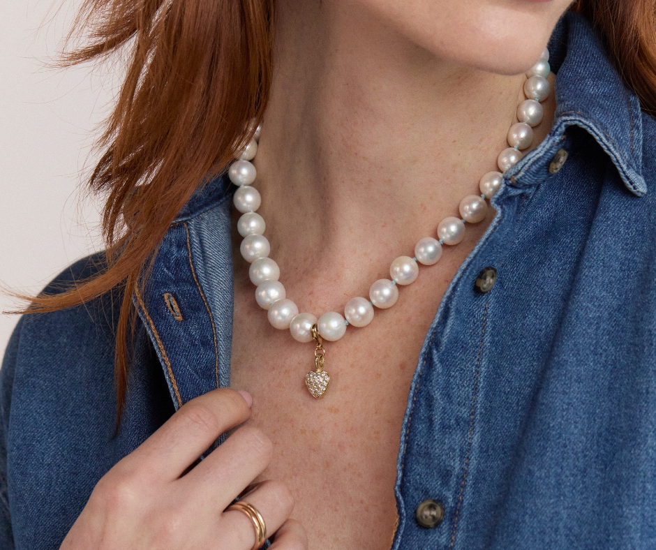 Inspired by summers in the South of France, this pearl necklace is made for days that gently drift into nights. Each strand is hand strung on a cornflower blue thread, a nostalgic shade drawn from the painted shutters of the Riviera. Finished with our gold pavé Midi Grateful Heart lobster clasp, set with nineteen diamonds, it carries a quiet reminder of gratitude and joy. A thoughtful gift to show someone they are enough, or a meaningful piece to wear as a reminder to give thanks for life and loved ones.
