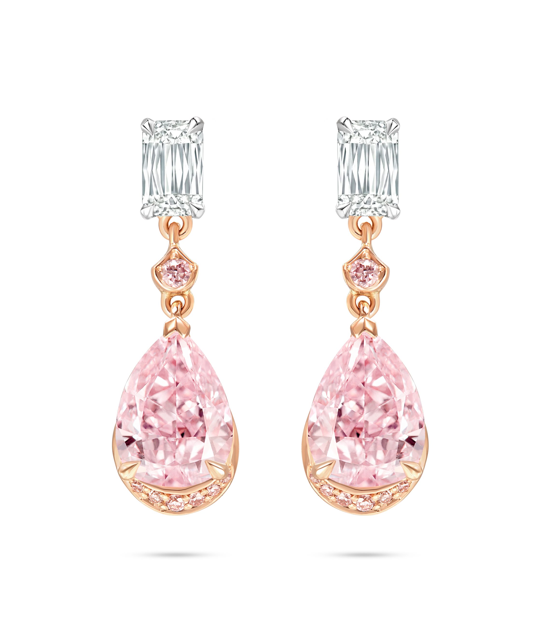 Boodles ‘Classic’ design earrings featuring pink pear diamonds, Ashoka diamonds and brilliant cut pink diamonds set in 18 carat Single Mine Origin rose gold, POA,