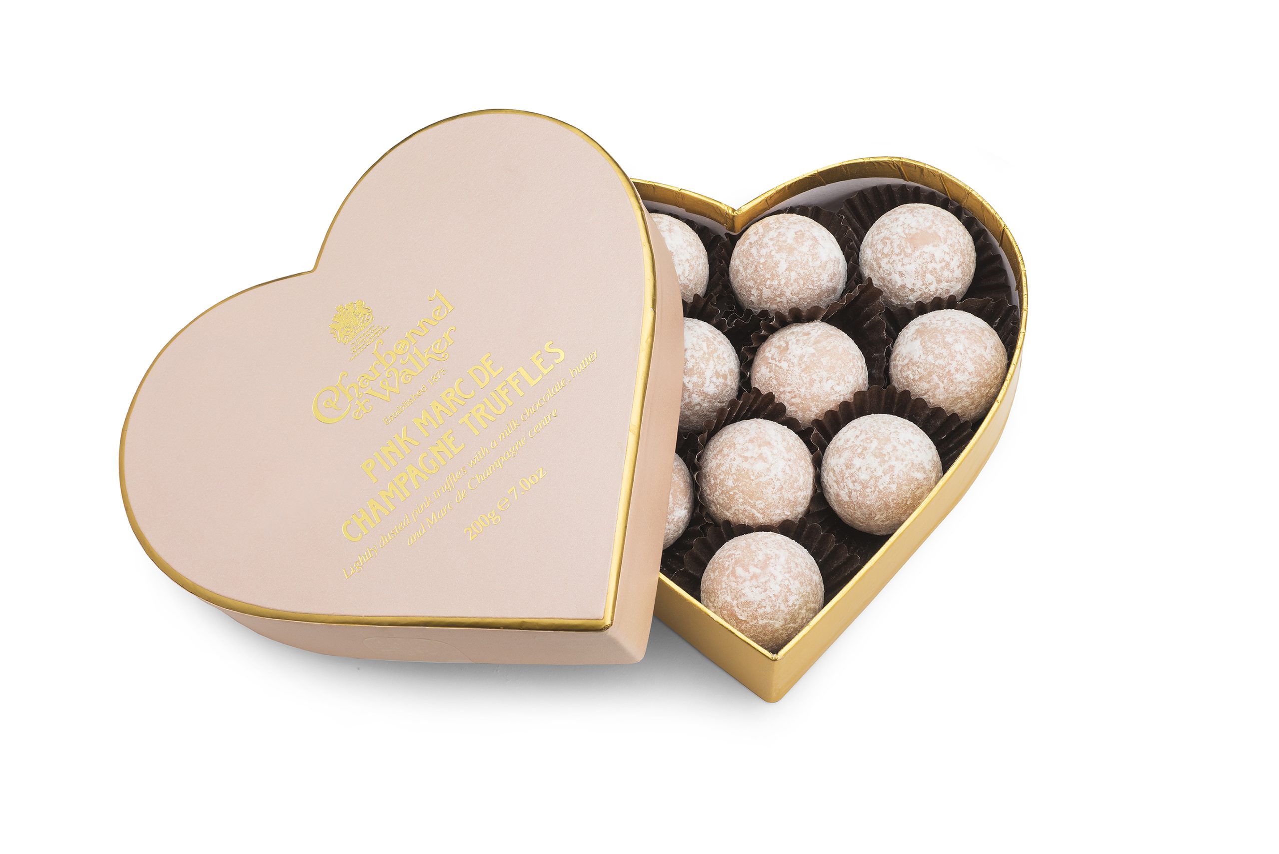 A beautiful heart shaped gift box filled with iconic Charbonnel et Walker Pink Marc de Champagne Chocolate Truffles. A lovely gift this Valentine’s tied with satin ribbons.
