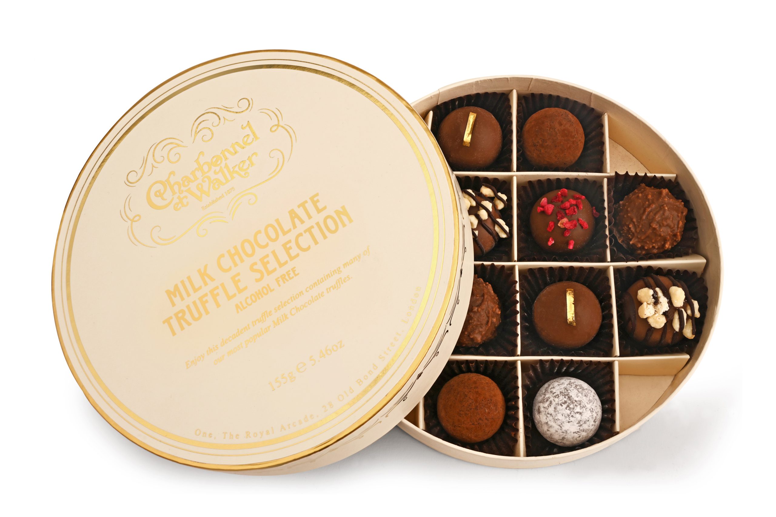 This elegant cream and gold Charbonnel et Walker gift box contains twelve classic Milk Chocolate Truffles. With two each of the following, Sea Salt Billionaire’s, Milk Sea Salt Caramel, Raspberry, Milk Chocolate, Milk Hazelnut Cream with edible gold leaf and Caramelised Biscuit Truffles. A sensational selection, beautifully presented with Charbonnel et Walker satin ribbons