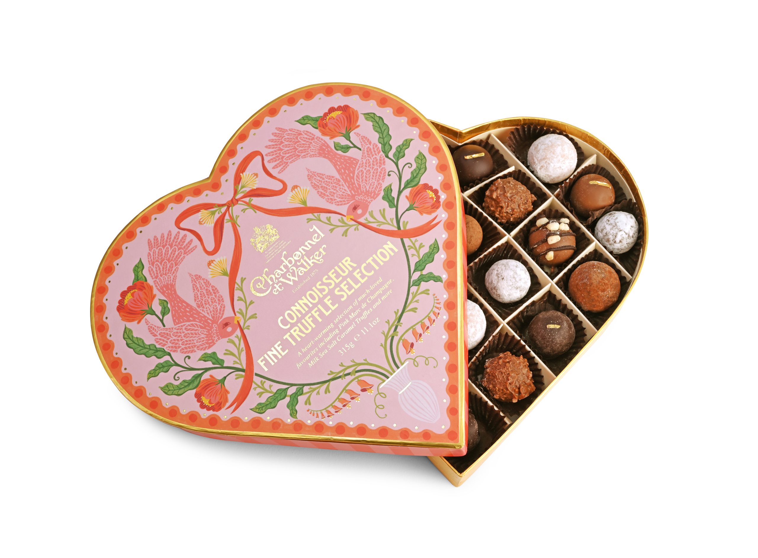 Vibrantly illustrated, ribbons flutter, Roses climb and Foxgloves bloom with this Charbonnel et Walker Connoisseur Fine Truffle Selection Heart. Favourites in this gift box are Pink Marc de Champagne Truffles, Milk Sea Salt Caramel, Dark Chocolate with Gold leaf, Billionaires shortbread Truffles and more. A decadent feast for Valentine’s!